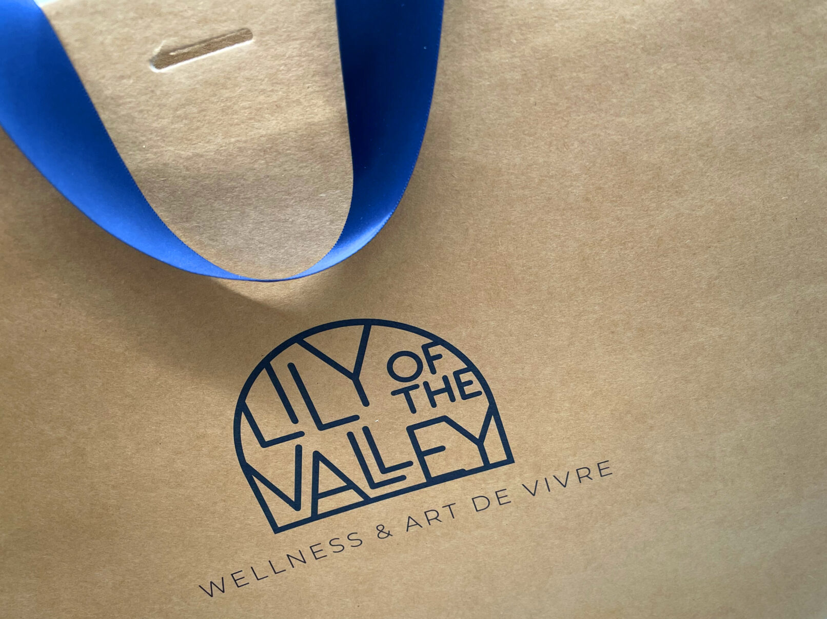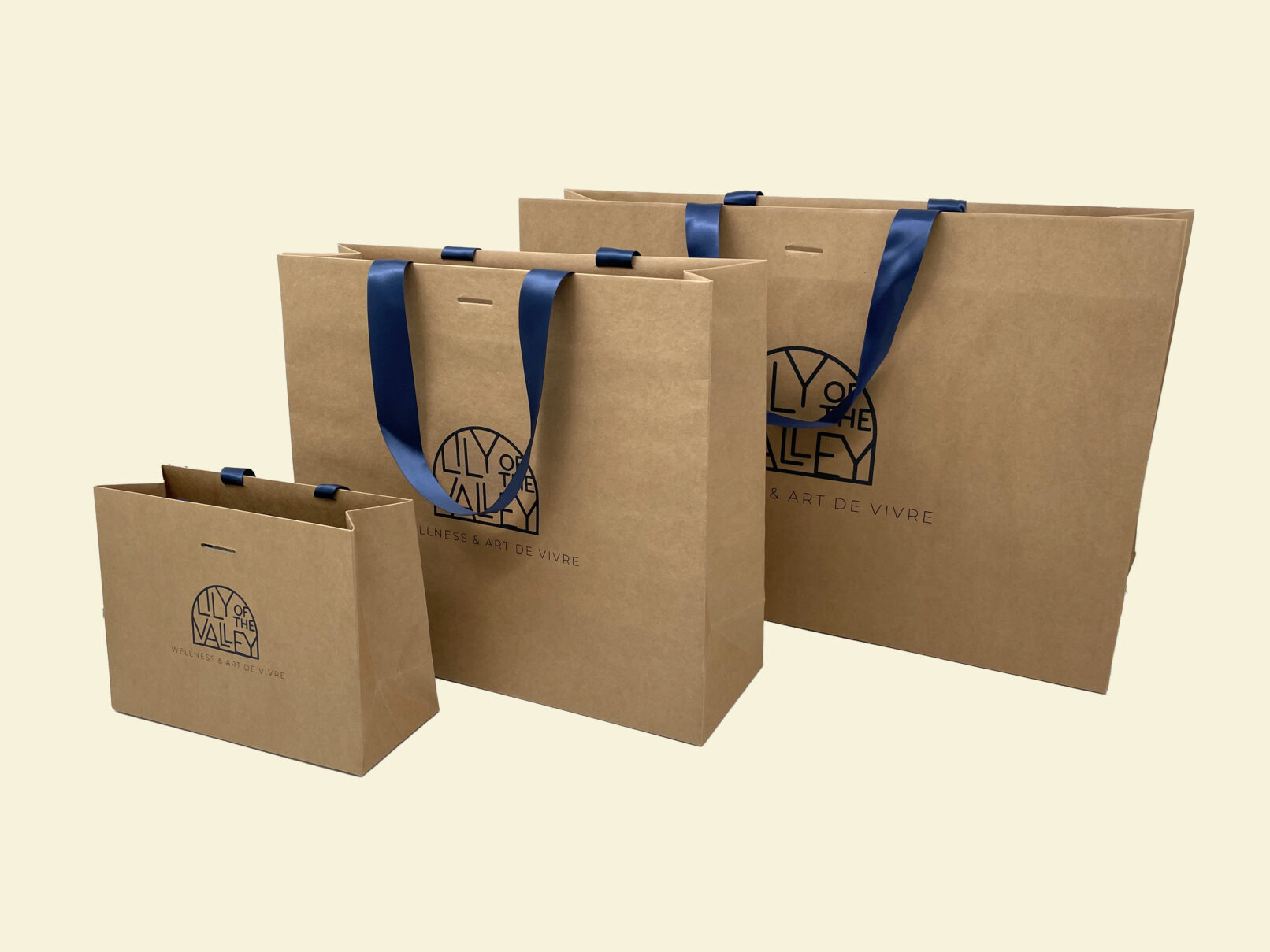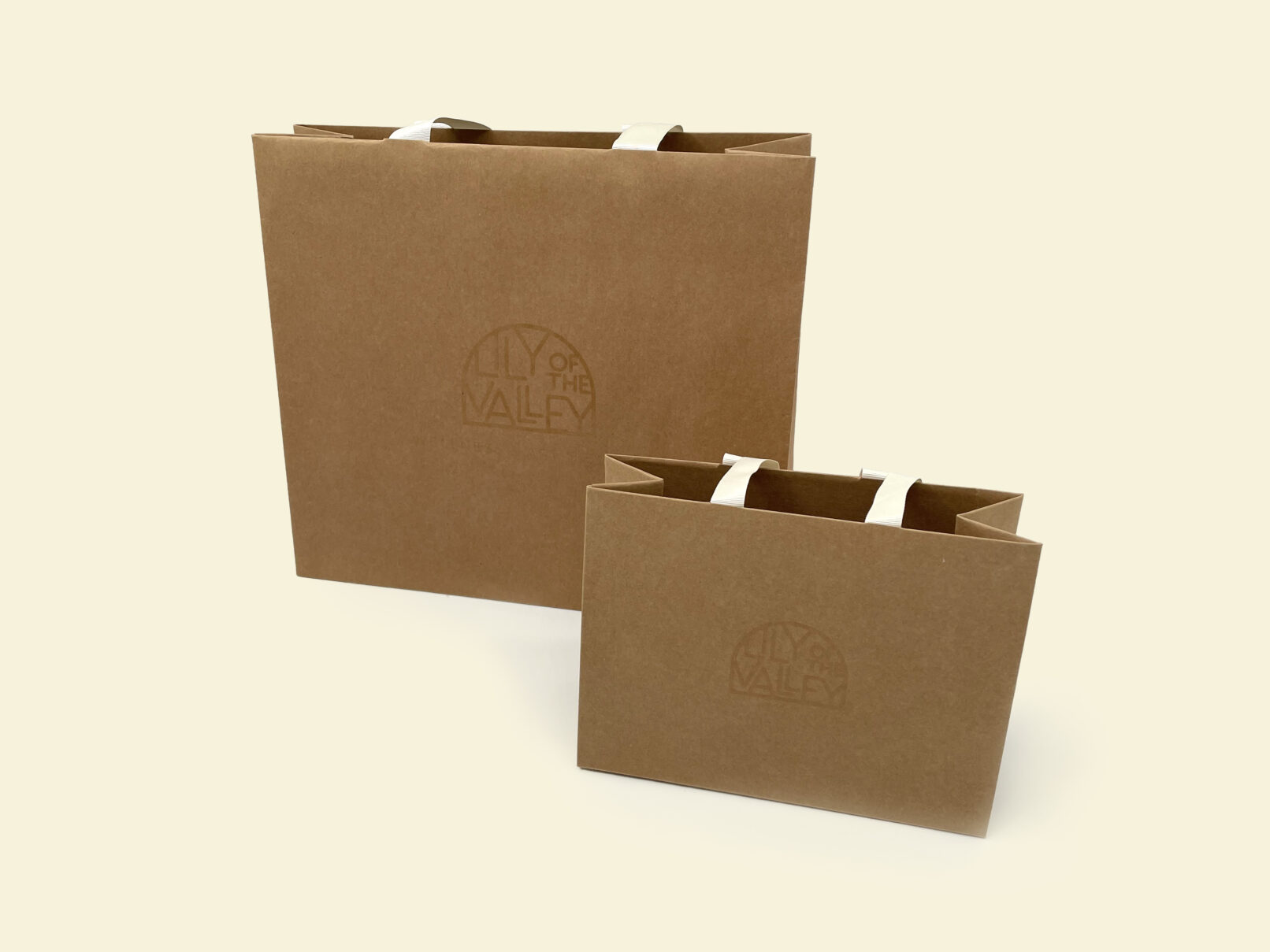 Tragetaschen – Braunes Kraftpapier – Version 2019-2020 mit Satinband und Logoprint – Version 2020-2021 mit Ripsband und UV Lack Logo